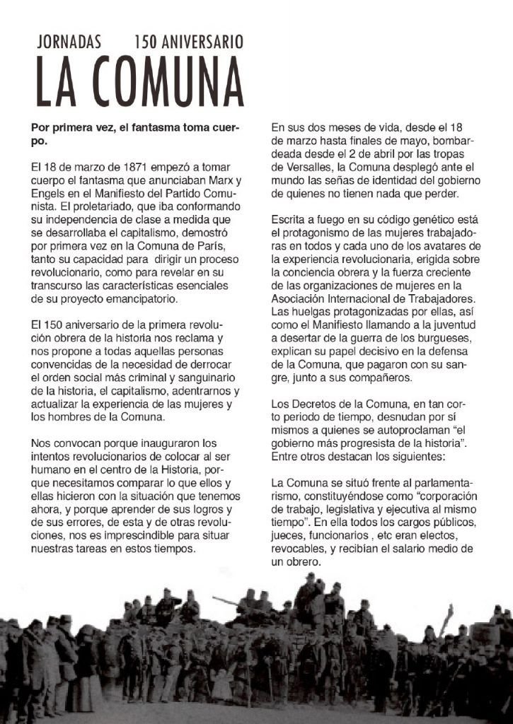El 150 aniversario de la primera revolución obrera de la historia nos reclama y nos propone a todas aquellas personas convencidas de la necesidad de derrocar el orden social más criminal y sanguinario de la historia, el capitalismo, adentrarnos y actualizar la experiencia de las mujeres y los hombres de la Comuna.