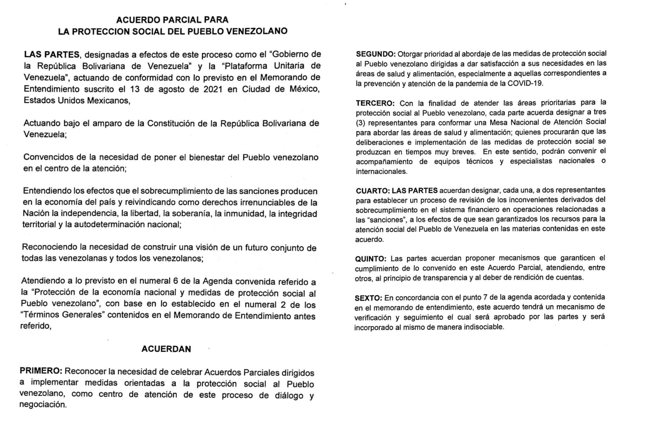 • Acuerdo parcial para la Protección Social del Pueblo Venezolano en relación a los efectos de las sanciones criminales sobre la economía y reivindicando la independencia, la soberanía y la autodeterminación.