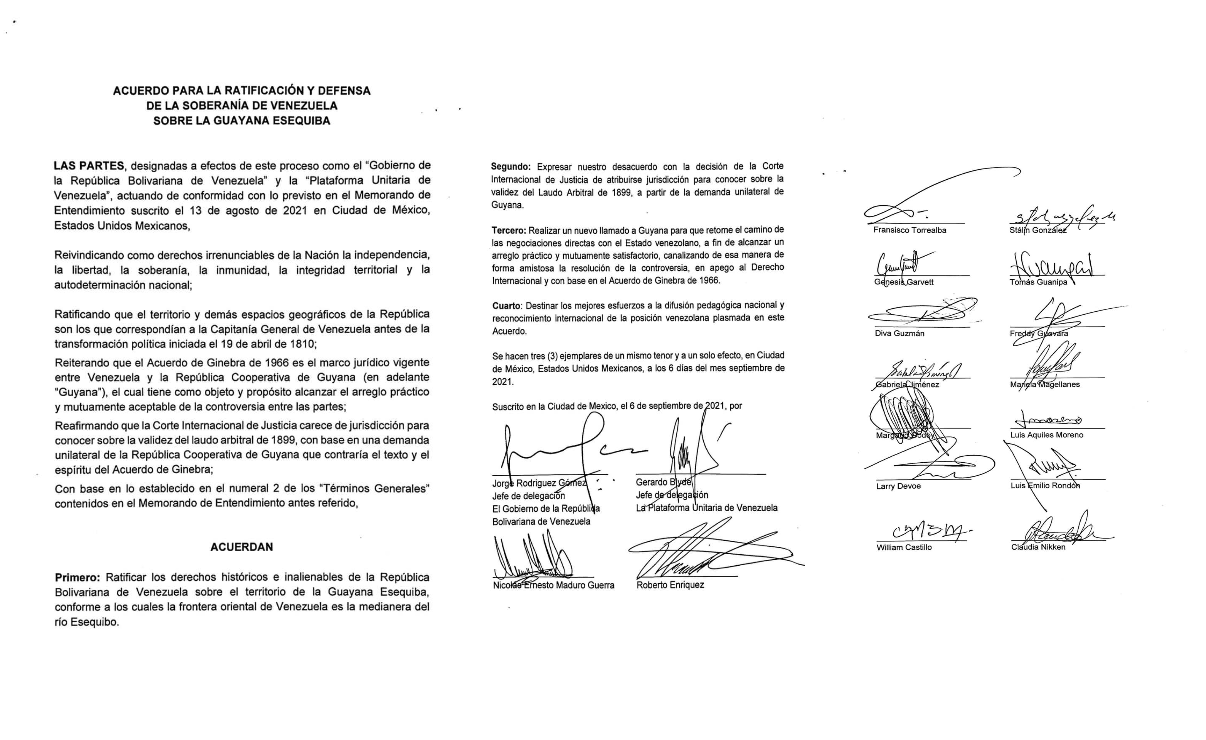 • Acuerdo de Ratificación y Defensa de la Soberanía de Venezuela sobre la Guayana Esequiba. Es el Acuerdo de Ginebra de 1966, el que reconocemos todos los venezolanos y las venezolanas, como marco jurídico vigente entre nuestro País y la República Cooperativa de Guyana.
