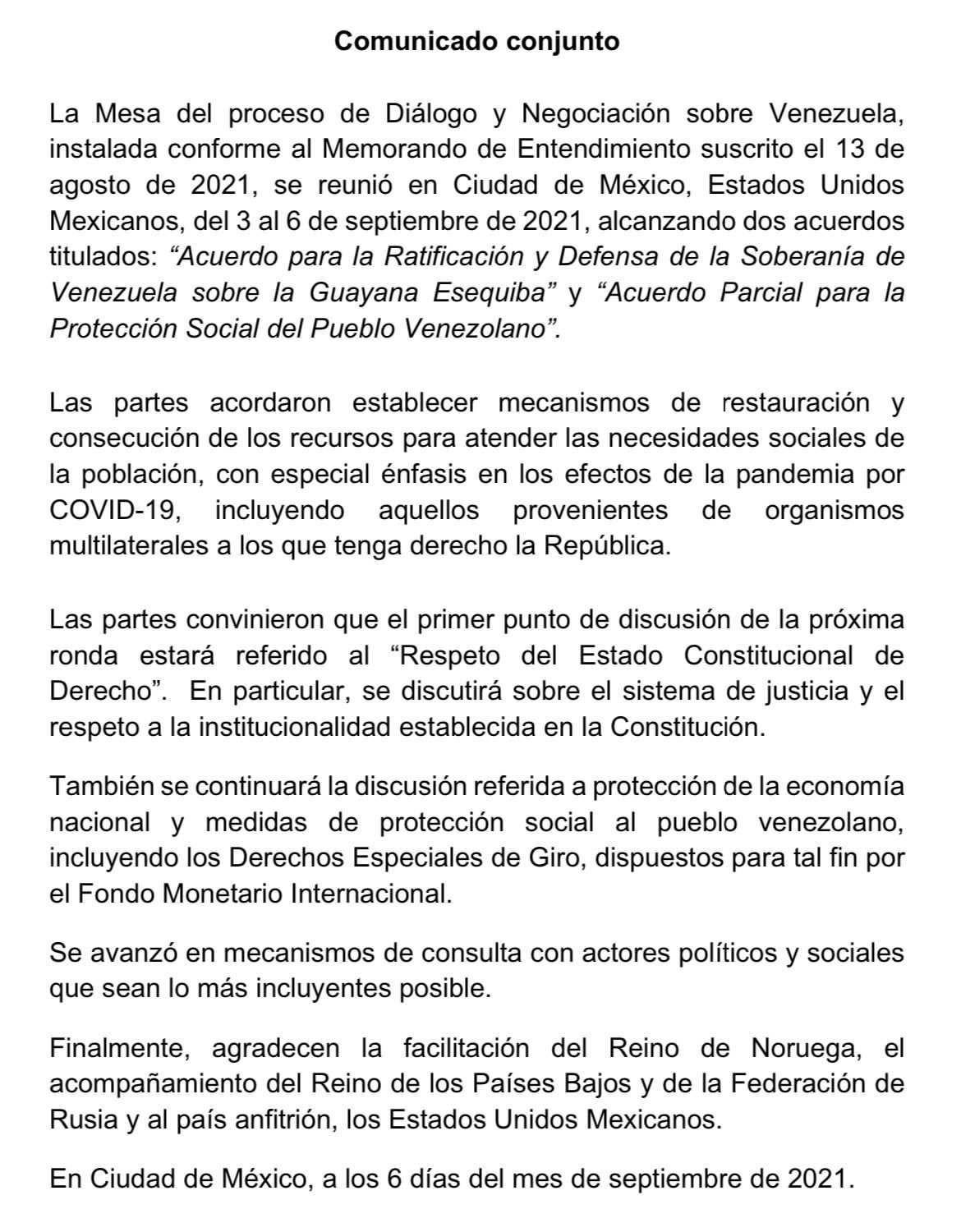 Presentamos el comunicado conjunto del primer acuerdo alcanzado por gobierno bolivariano y las oposiciones en las negociaciones llevadas a cabo en México y cuya segunda ronda concluyó ayer.