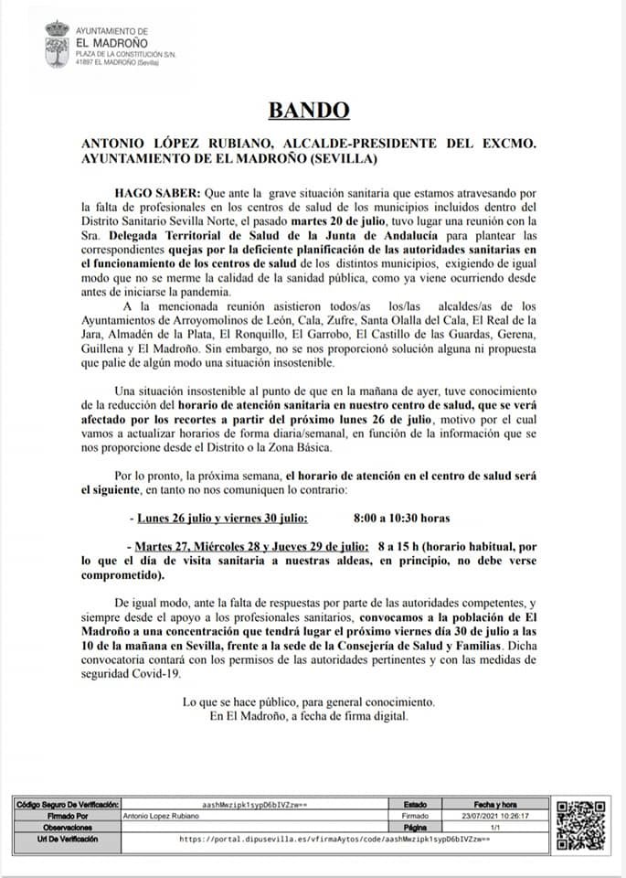Adjuntamos Bando municipal del Ayuntamiento de El Madroño y comunicado de la zona Básica de Salud Guillena-Santa Olalla del Distrito Sanitario Sevilla Norte