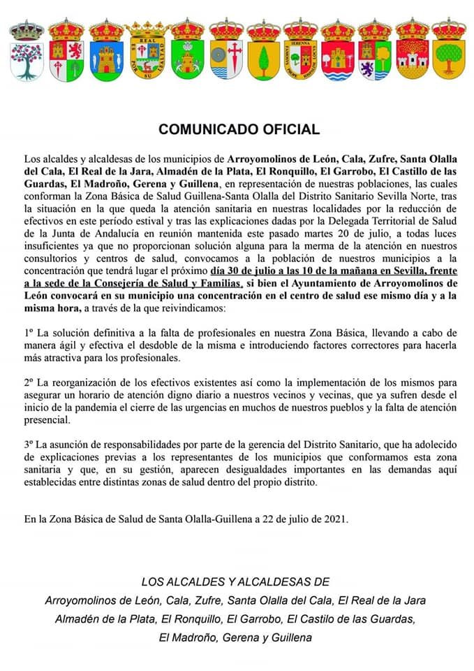 La zona Básica de Salud Guillena-Santa Olalla del Distrito Sanitario Sevilla Norte formada por los municipios de Arroyomolinos de León, Cala, Zufre, Santa Olalla del Cala, El Real de la Jara, Almadén de la Plata, El Ronquillo, El Garrobo, El castillo de las Guardas, El Madroño, Gerena y Guillena, ante la situación en la que queda la atención sanitaria en estas localidades debido a la reducción de trabajadores sanitarios en el período estival y a la no sustitución de los mismos debido a los recortes y ante la falta de soluciones de la Delegada Territorial de Salud de la Junta de Andalucía hacen un llamamiento a a la población de sus vecinos EN DEFENSA DE LA SANIDAD PÚBLICA TAMBIÉN EN EL MUNDO RURAL el día 30 de julio a las 10:00 de la mañana frente a la sede de la Consejería de Salud y Familias en Sevilla.